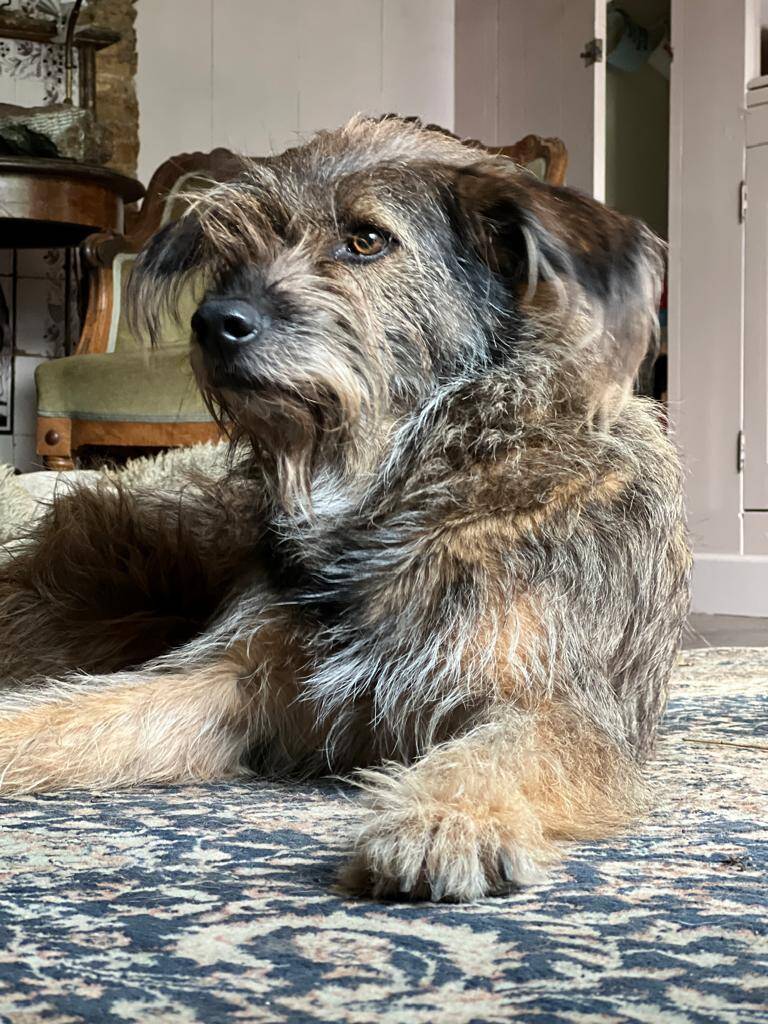 Een echte border terriër knuffelkont. Ticcie is sinds pup bij ons en geboren in Engeland.